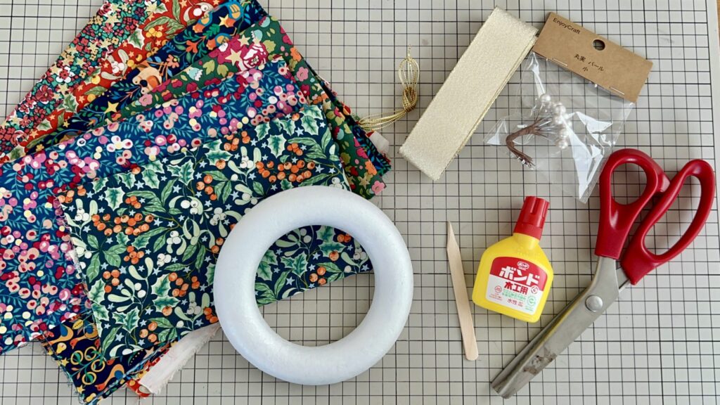 今回は、リバティのクリスマスコレクション生地を使って、ミシンなしで作れる「布リース」の作り方をご紹介します。