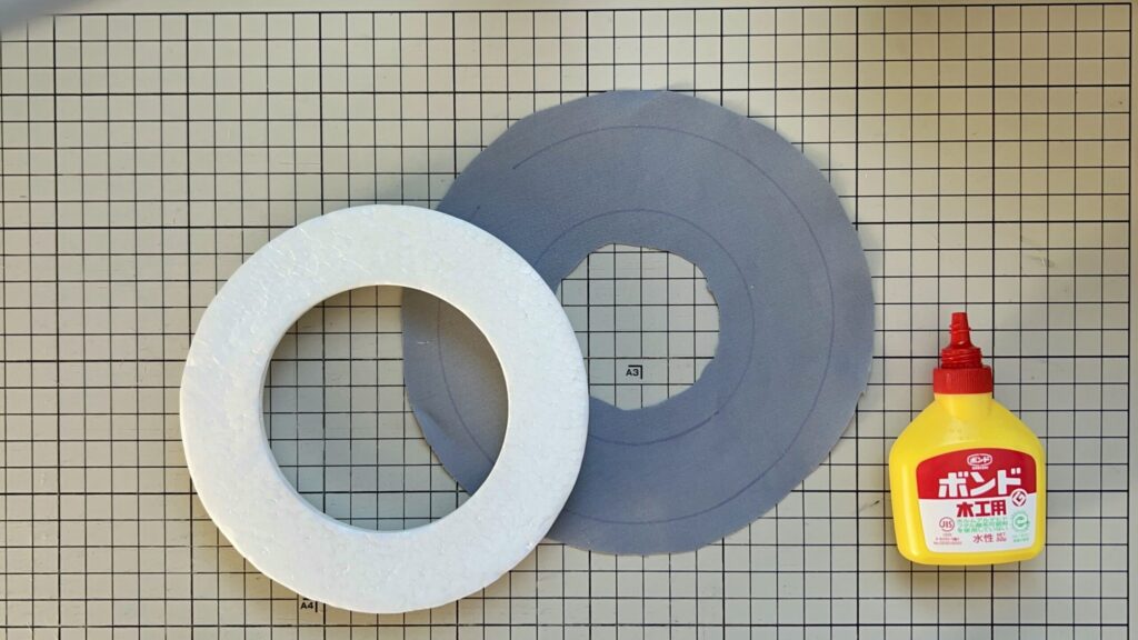 裏地用の布にリース土台を置き、型を取り、外側・内側ともにのりしろ1cmをつけて裁断します。