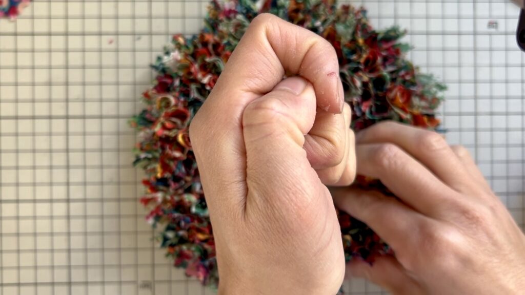 吊り下げて飾る場合は、最後に吊り下げ用の紐を土台に結びつけておきます。