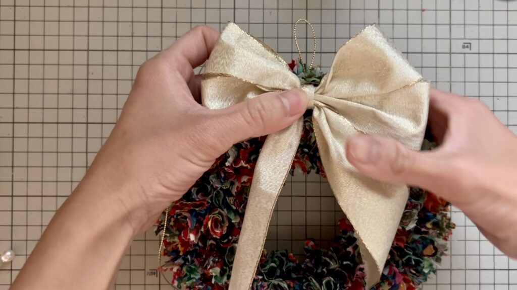 リボンの後ろに紐を通し、リースに結んで固定してあります。