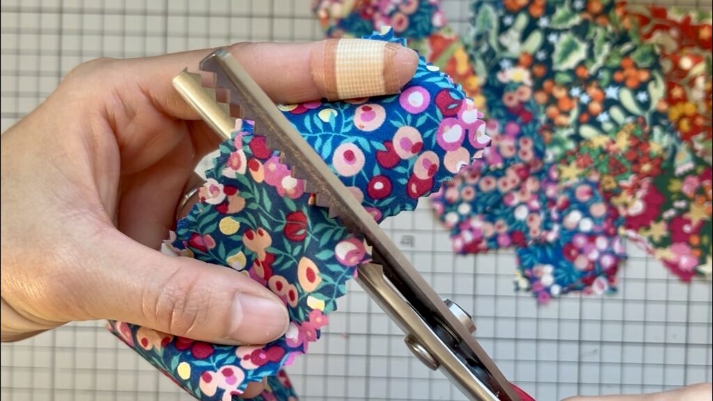 ピンキングはさみで布を5cm角にカットします。