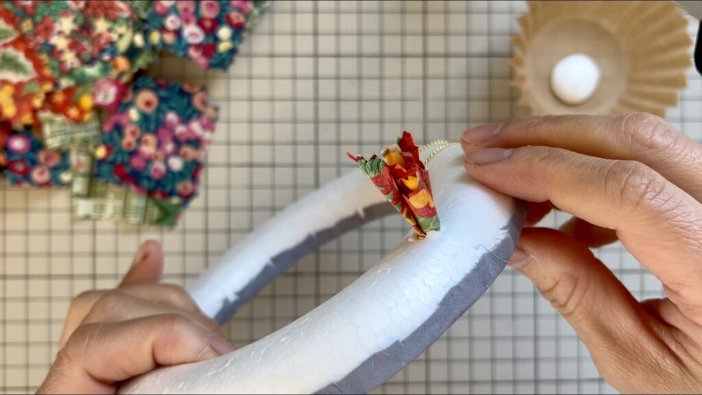 リースにすると一つ一つの柄は目立ちにくくなりますが、全体として見るとリバティの多色使いが映えて「やっぱりリバティは違うな」と感じる仕上がりになります。